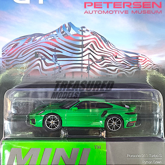 Mini GT Porsche 911 Turbo S Python Green Petersen Automotive Museum Blister Packaging MGT00525 1/64 Diecast