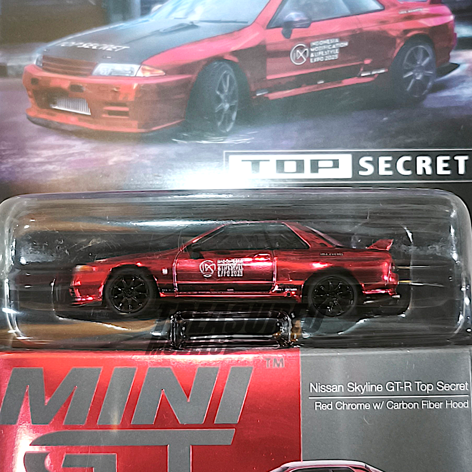 Mini GT Nissan Skyline GT-R Top Secret Red Chrome w Carbon Fiber Hood IMX 2025 MGT01073 1/64 Diecast